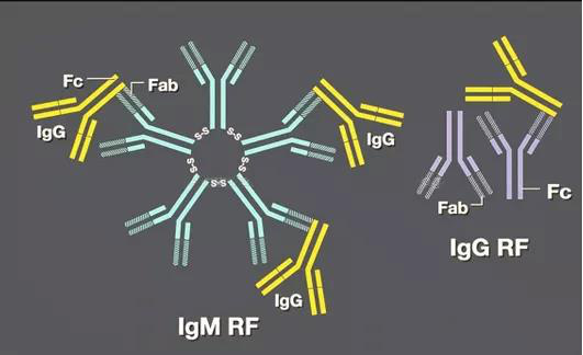 最經(jīng)典的例子是 1940 年代Waaler在某些RA患者血清中發(fā)現(xiàn)類風(fēng)濕因子 (rheumatoid factors, RF)。在1958年RF血清中呈陽(yáng)性被美國(guó)風(fēng)濕病學(xué)會(huì)納入類風(fēng)濕性關(guān)節(jié)炎確診標(biāo)準(zhǔn)里,一起被列入確診標(biāo)準(zhǔn)的還有“晨僵”“關(guān)節(jié)活動(dòng)痛苦或壓痛”“對(duì)稱性關(guān)節(jié)腫脹”“皮下結(jié)節(jié)”“受累關(guān)節(jié)X線片改變”等。但很多沒(méi)有 RA 的人也有 RF 陽(yáng)性。