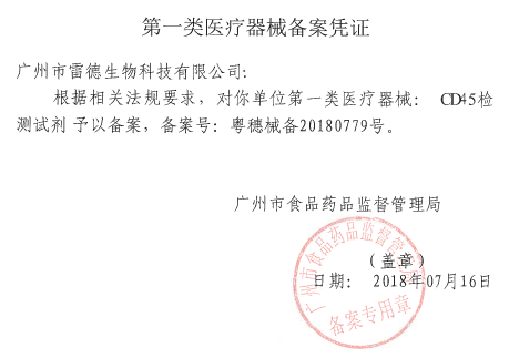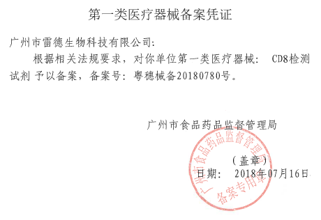 2018年7月16日,我公司自主研發(fā)的4款流式抗體產(chǎn)品“CD3、CD4、CD8、CD45檢測(cè)試劑”均通過(guò)了廣州市食品藥品監(jiān)督管理局的Ⅰ類醫(yī)療器械產(chǎn)品審批備案,正式獲準(zhǔn)上市銷售。