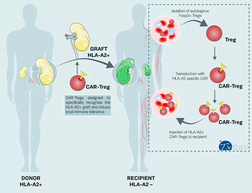 HLA-A2 CAR-Treg是TxCell公司的CAR Treg明星候選產(chǎn)品,它基于CD4+ FoxP3 + Treg的一個(gè)子集,靶向移植中常見的錯(cuò)配抗原HLA A2,正在開發(fā)用于預(yù)防器官移植后的慢性排斥反應(yīng)。目前,HLA-A2 CAR Treg已經(jīng)在臨床前GvHD模型中顯示出了強(qiáng)有效性,相關(guān)臨床試驗(yàn)正在準(zhǔn)備階段。