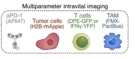 他們發(fā)現(xiàn)在結(jié)腸癌模型小鼠體內(nèi)注射標(biāo)記的PD-1抗體5分鐘后,就在腫瘤微環(huán)境內(nèi)的T細(xì)胞上發(fā)現(xiàn)了染色標(biāo)記。這是最早在腫瘤組織中檢測(cè)到被標(biāo)記的細(xì)胞。研究人員觀察到,最開(kāi)始標(biāo)記的PD-1抗體結(jié)合到腫瘤浸潤(rùn)T細(xì)胞周圍而幾分鐘后在T細(xì)胞表明形成色塊,之后,這些色塊被發(fā)現(xiàn)都在腫瘤相關(guān)巨噬細(xì)胞內(nèi)。