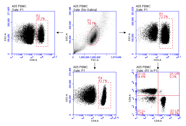 我們在使用流式細胞儀檢測外周血單個核細胞(peripheral blood mononuclear cell,PBMC)時,是不是常會發(fā)現(xiàn)CD3+T細胞的比例稍高與CD4+T細胞與CD8+T細胞的比例之和?這是因為在CD3+T細胞中,不僅含有CD4+CD8-T細胞和CD4-CD8+T細胞,還含有少量的CD4+CD8+T細胞和CD4-CD8-T細胞,如圖一。
