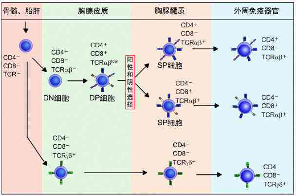 圖2 T細胞分化發(fā)育過程(圖來源網(wǎng)絡(luò))