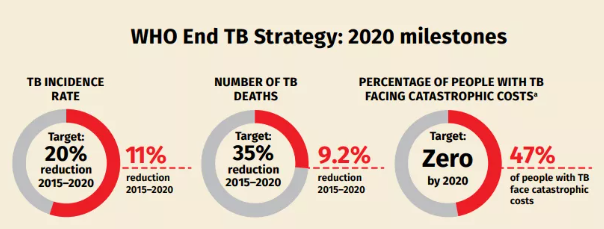 2014年和2015年世界衛(wèi)生組織和聯(lián)合國提出可持續(xù)發(fā)展目標,希望2035年能夠終止結(jié)核病的流行,2020是作為里程碑的一年,結(jié)核防治結(jié)果卻遠遠未達到預期。與2015年相比,2020年結(jié)核病發(fā)病率目標是降低20%,目前只降低了11%;結(jié)核病的死亡人數(shù)是降低35%,目前只降低了9.2%;由于結(jié)核病治療導致家庭經(jīng)濟面對巨大困難的百分比降至0%,目前只達到47%。