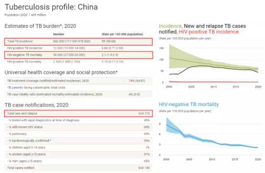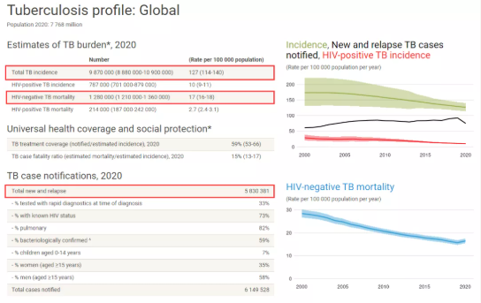 從數(shù)據(jù)來看,2020年,WHO預估全球結(jié)核病新發(fā)病例為987萬(發(fā)病率為127/10萬),因結(jié)核病死亡(艾滋病陰性患者)的人數(shù)為128萬(死亡率為17/10)。