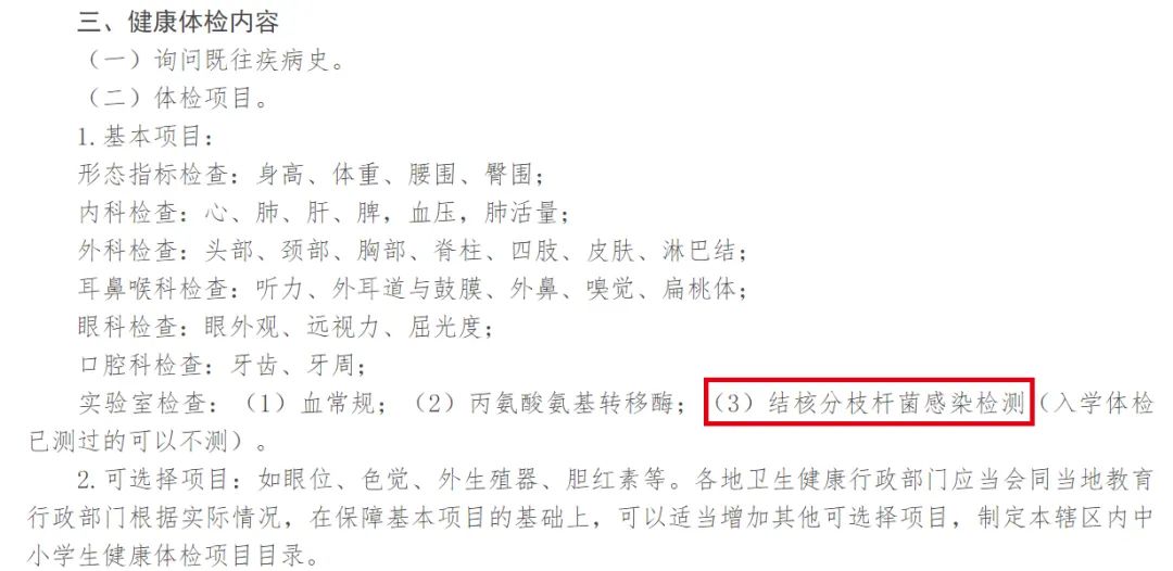 《辦法》明確規(guī)定學生健康檢查基本項目(也就是必檢項目),包括形態(tài)指標檢查、內(nèi)科、外科、耳鼻、眼科、口腔科,以及血常規(guī)檢查、丙氨酸氨基轉(zhuǎn)移酶以及結(jié)核分枝桿菌感染檢測??梢钥闯?,《辦法》針對結(jié)核病防控提出了更高的要求: