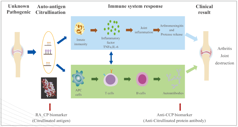從2000年以來(lái),除了國(guó)際公認(rèn)的RA診斷指南中CCP外,一直未有突破性的高靈敏指標(biāo)。我公司研發(fā)出最具潛力的RA血清學(xué)診斷新指標(biāo)——RA_CP(類風(fēng)濕關(guān)節(jié)炎瓜氨酸化蛋白檢測(cè)試劑盒),采用雙抗體夾心法測(cè)定人血清中瓜氨酸化類風(fēng)濕抗原,這是根據(jù)抗原-抗體的出現(xiàn)時(shí)間先后,疾病發(fā)生原理設(shè)計(jì)和臨床大量樣本驗(yàn)證了的一個(gè)檢測(cè)類風(fēng)濕關(guān)節(jié)炎疾病的新指標(biāo)。RA_CP對(duì)RA的檢測(cè)靈敏度85%-95%,特異性85%-95%,對(duì)于常規(guī)CCP檢測(cè)陰性的RA患者,RA_CP仍可檢出40%-50%(截至目前的數(shù)據(jù)是超過(guò)50%)。在CCP陰性患者中使用RA_CP可提高RA患者檢出率,提高臨床診斷類風(fēng)濕性關(guān)節(jié)炎的準(zhǔn)確性,顯著降低臨床漏診發(fā)生率,開(kāi)展RA_CP檢測(cè)項(xiàng)目在臨床上可以更好地輔助RA診斷。
